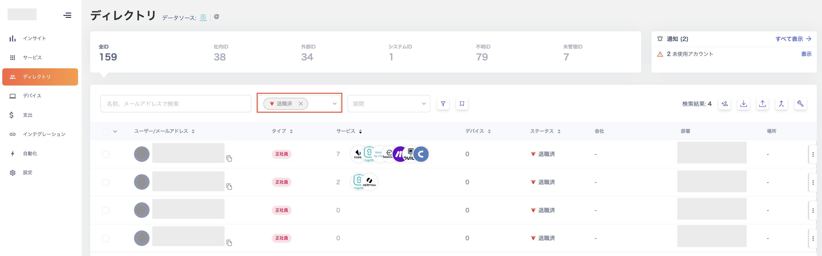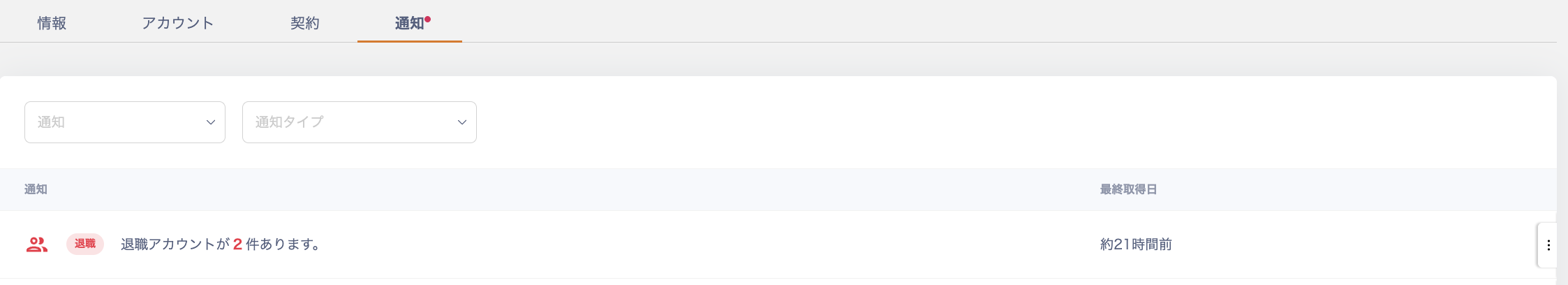 サービス>該当サービス>通知で退職アカウントを確認できます。詳細はアラート通知の運用手順をご参照ください。