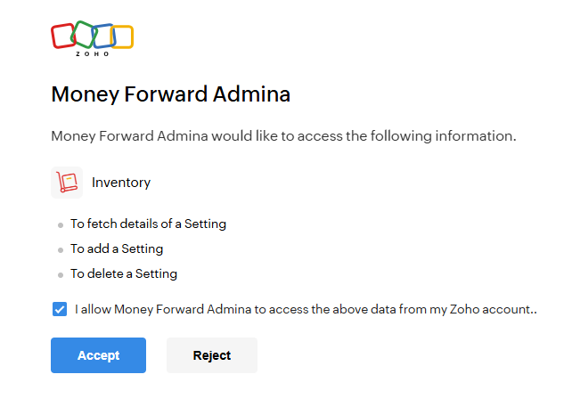 マネーフォワードAdminaのインテグレーション画面にて、Zoho Inventoryで検索し、連携するをクリックします。