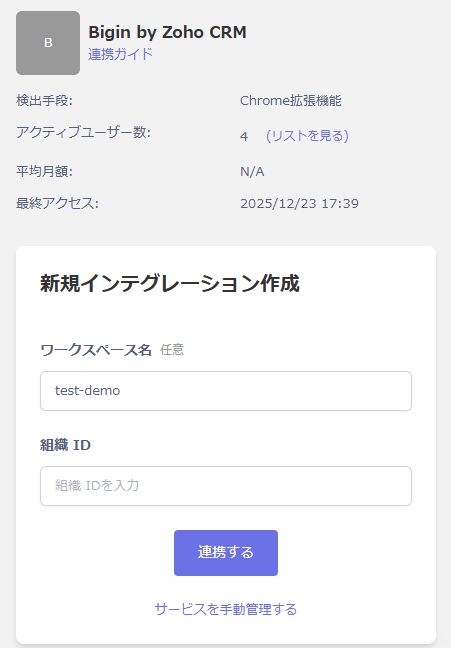 マネーフォワードAdminaのインテグレーション画面にて、Bigin by Zoho CRMで検索します。