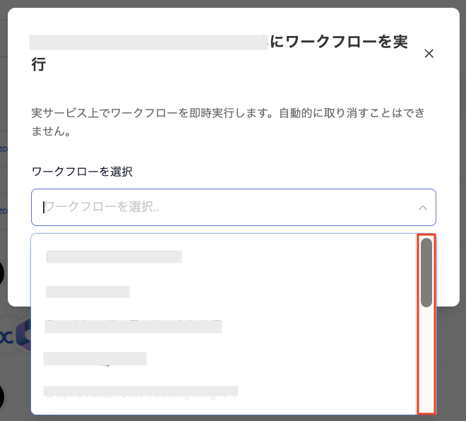 - 「ワークフローを実行」画面で「ワークフローを選択」のプルダウンメニューから、実行したいワークフロー名を選択します。