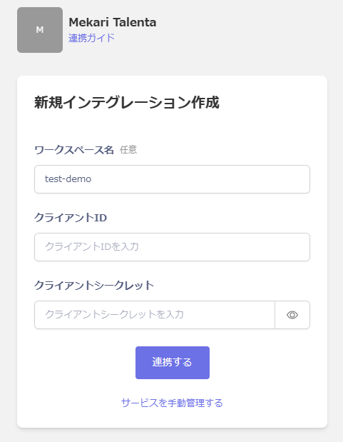 任意のワークスペース名、前の手順で取得したクライアントID、クライアントシークレットを入力し、連携するをクリックします。