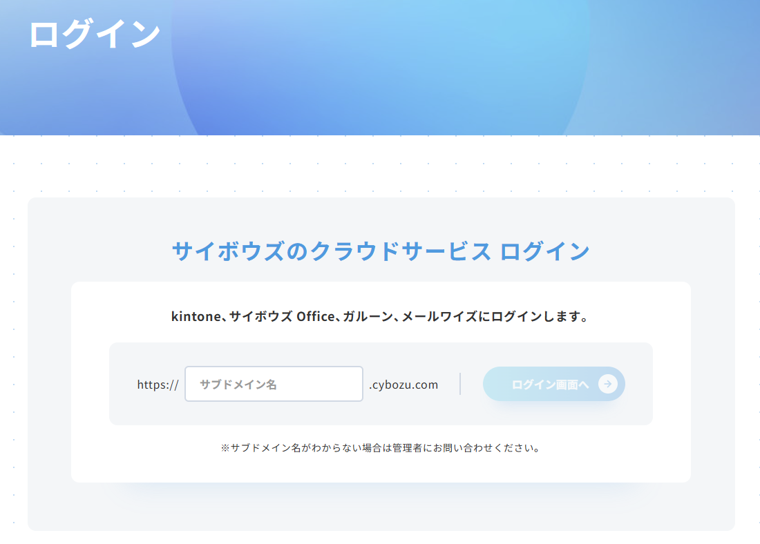 サイボウズログインページにて、サブドメイン名、メールアドレス・パスワードを入力し、ログインします。
