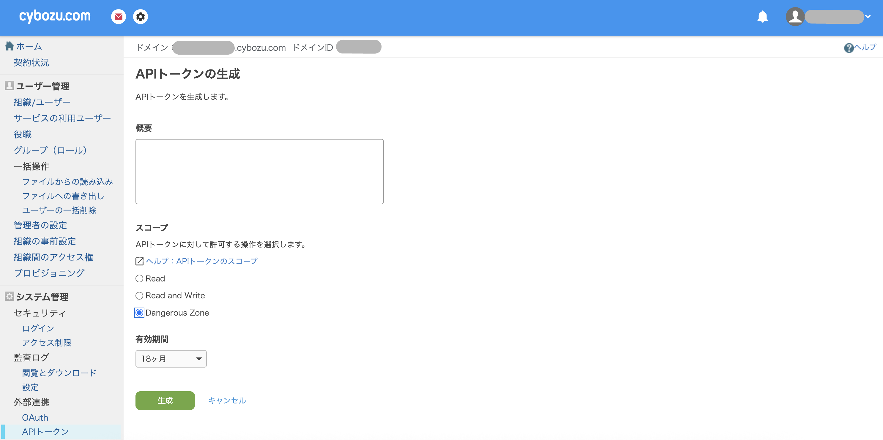 cybozu.com共通管理 > 外部連携 > APIトークンをクリックします。