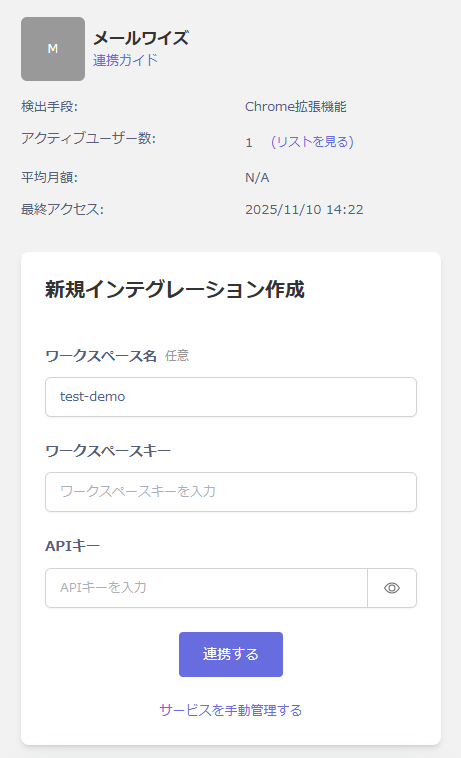 任意のワークスペース名と、前の手順で取得したワークスペースキー、APIキーを入力し、連携するをクリックします。