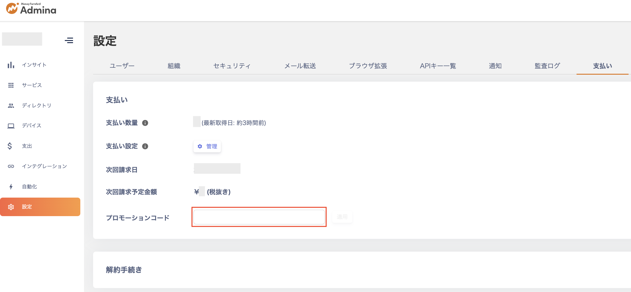 マネーフォワード Adminaの支払画面からプロモーションコードを適用できるようになりました。