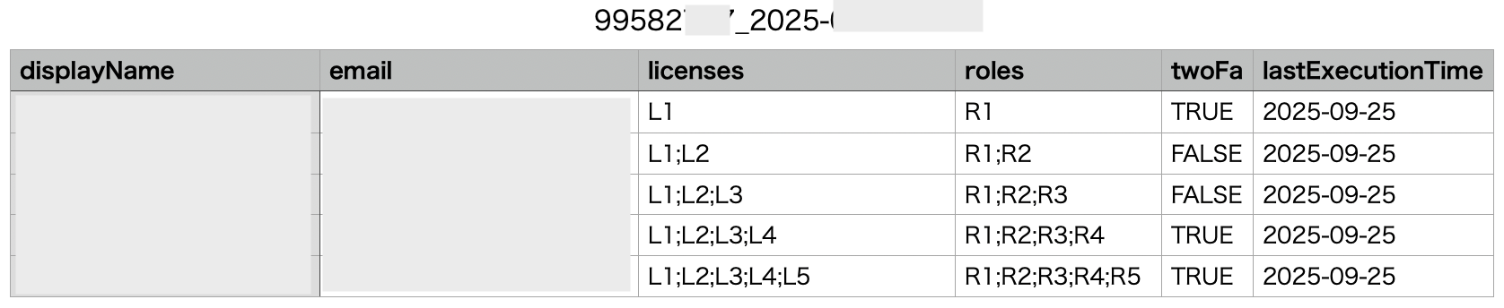 - CSVの「licenses」「roles」欄にライセンスやロールを複数登録します。「;」で区切って登録します。