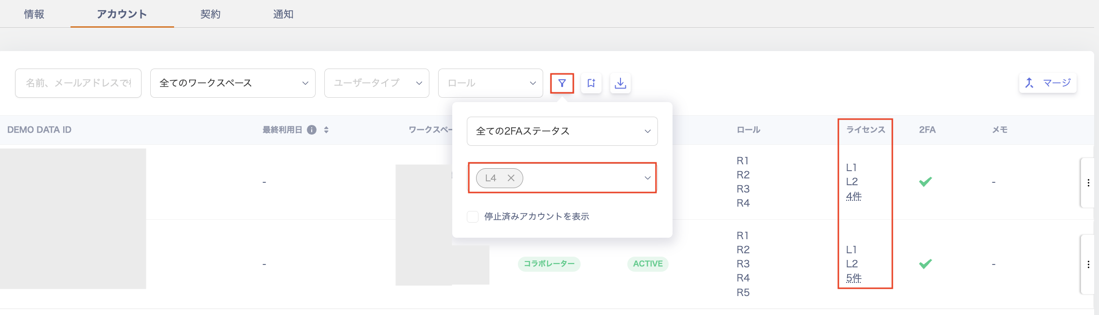 画面上部の絞り込み「ライセンス」では、登録したライセンスでの絞り込みも可能です。