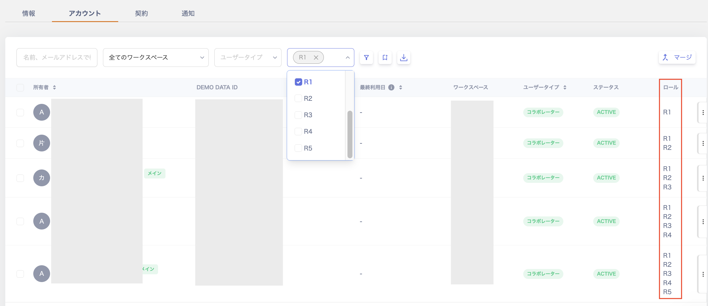 画面上部の絞り込み「ロール」では、登録したロールでの絞り込みも可能です。