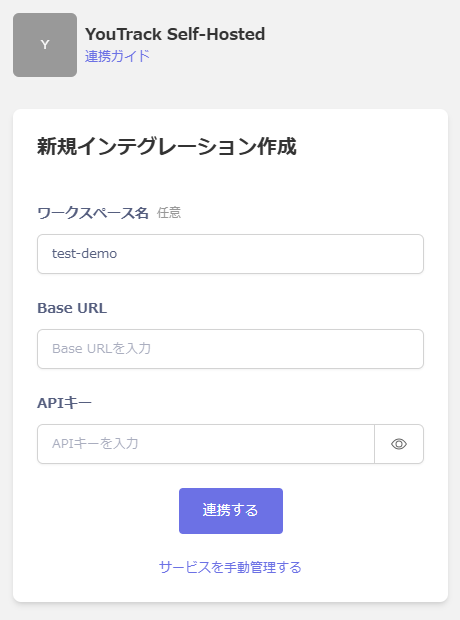 任意のワークスペース名、前の手順で取得したBase URL、APIキーを入力し、連携するをクリックします。