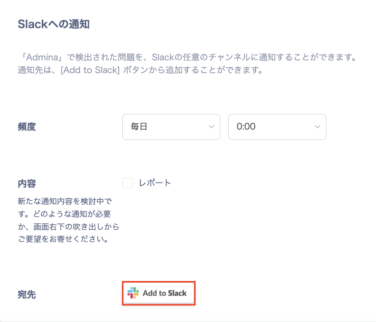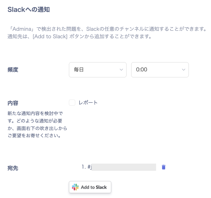 - 設定 > 通知 > Slackへの通知で頻度と送信する内容(レポート)を選択し、宛先で[