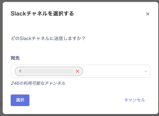 - 通知したいチャンネルを検索して設定し、[選択]をクリックします。複数のチャンネルも選択可能です。