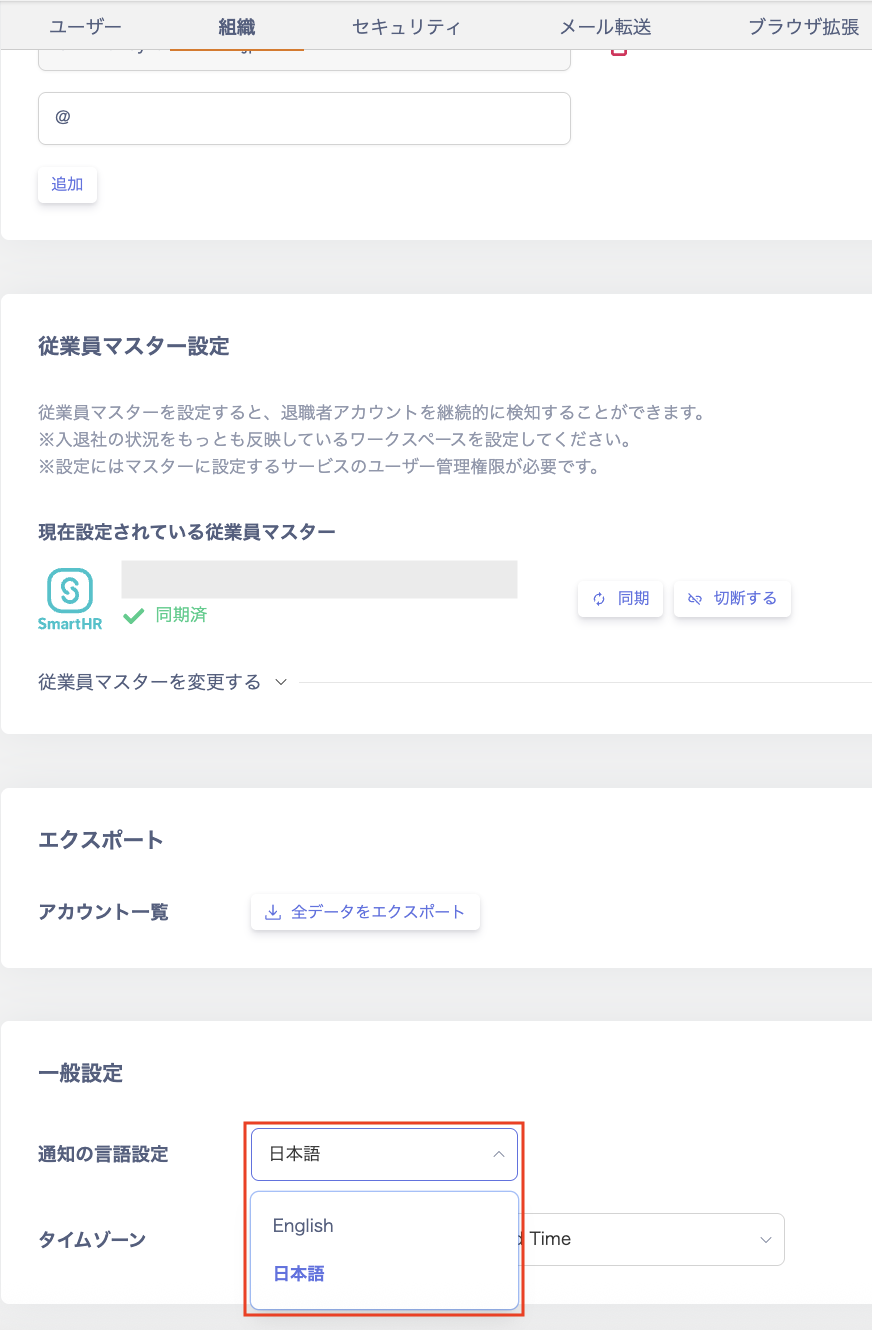 設定 > 組織 > 一般設定の「通知の言語設定」でEnglishを選択します。