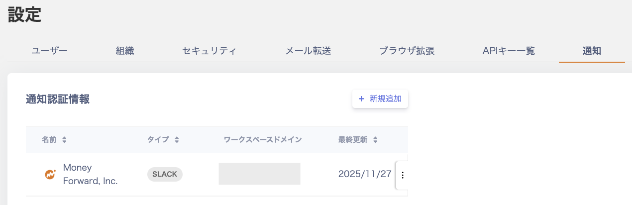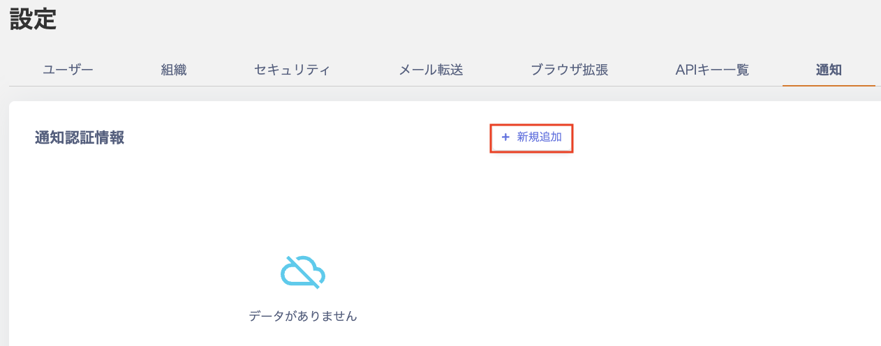 - 設定 > 通知 > 通知認証情報で[+新規追加]をクリックします。