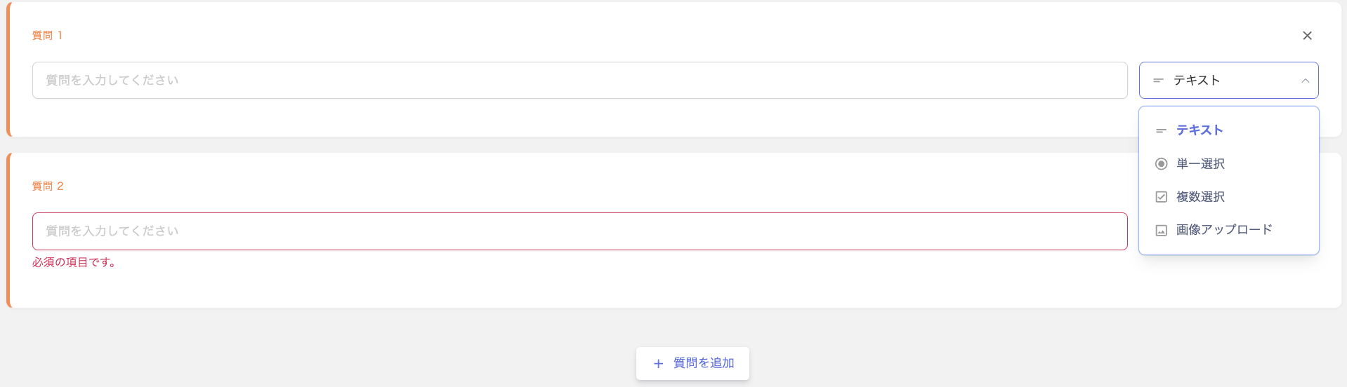 - 質問を追加する場合、[+質問を追加]をクリックします。設問数に合わせて、[+質問を追加]します。
