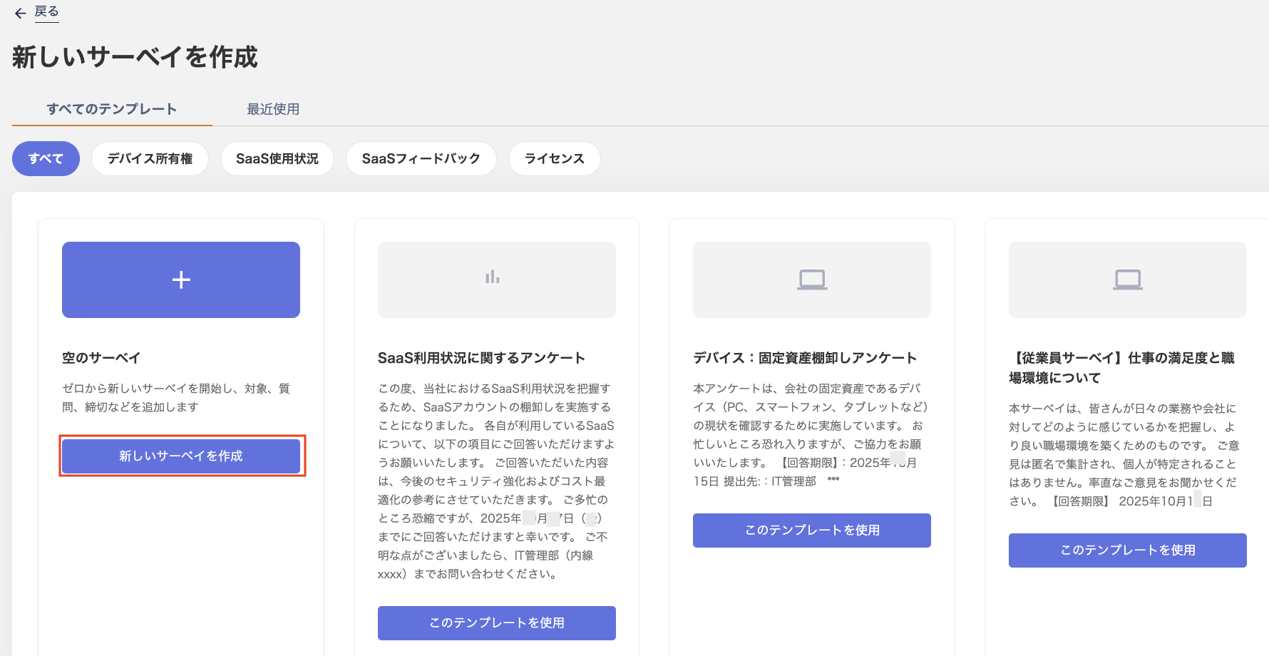 本ページでは新しいサーベイを作成する手順や作成したサーベイの操作方法についてご説明します。サーベイ実施前にサーベイ実施から活用までの流れもご参照ください。