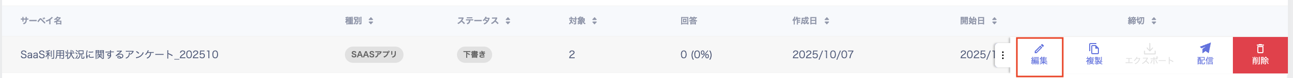 - サーベイ一覧画面で編集するサーベイを選択して[編集]、または三点リーダーから[編集]をクリックします。