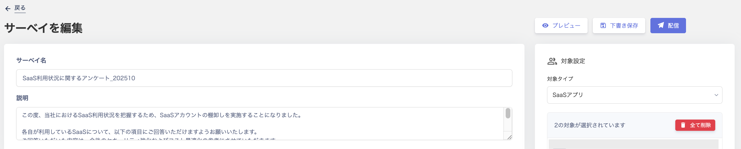 - 「サーベイを編集」画面が表示されますので、サーベイを編集します。サーベイを配信する場合は[配信]をクリックします。