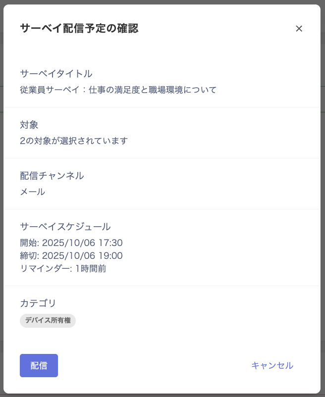 - 次に「サーベイ配信予定の確認」画面が表示されますので確認の上、[配信]をクリックします。