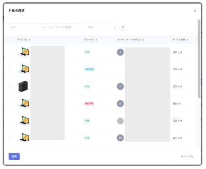 対象を選択する際、「名前、メールアドレスで検索」や絞り込み「ステータス/期間/その他絞り込み」もご利用ください。