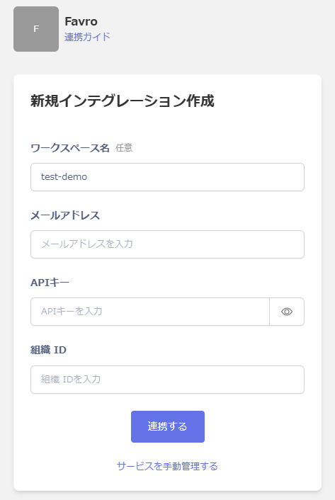 前の手順で取得したAPIキー、組織IDを入力し、連携するをクリックします。