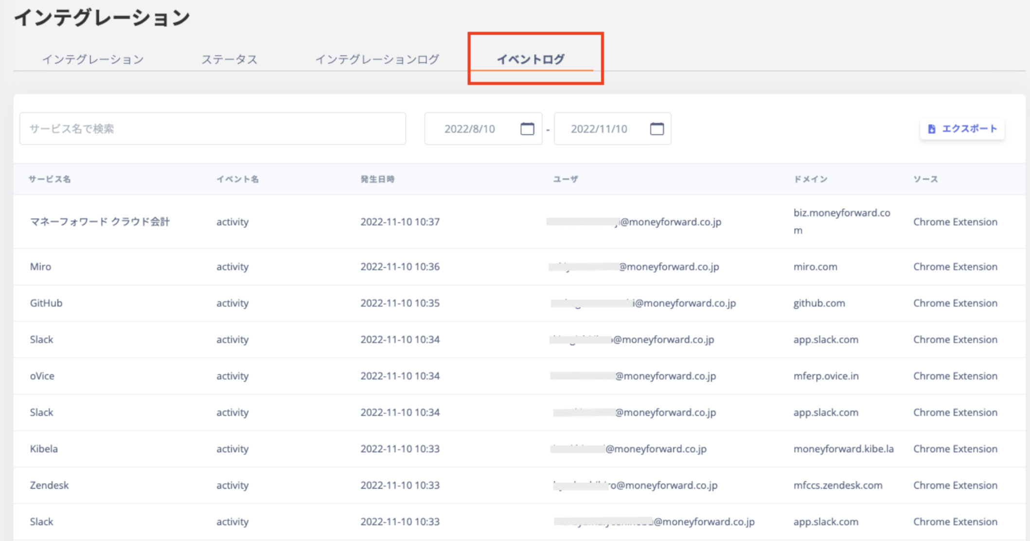 インテグレーション > イベントログからChrome Extentionの履歴が表示されるかご確認ください。