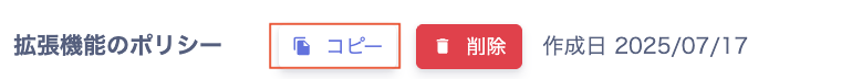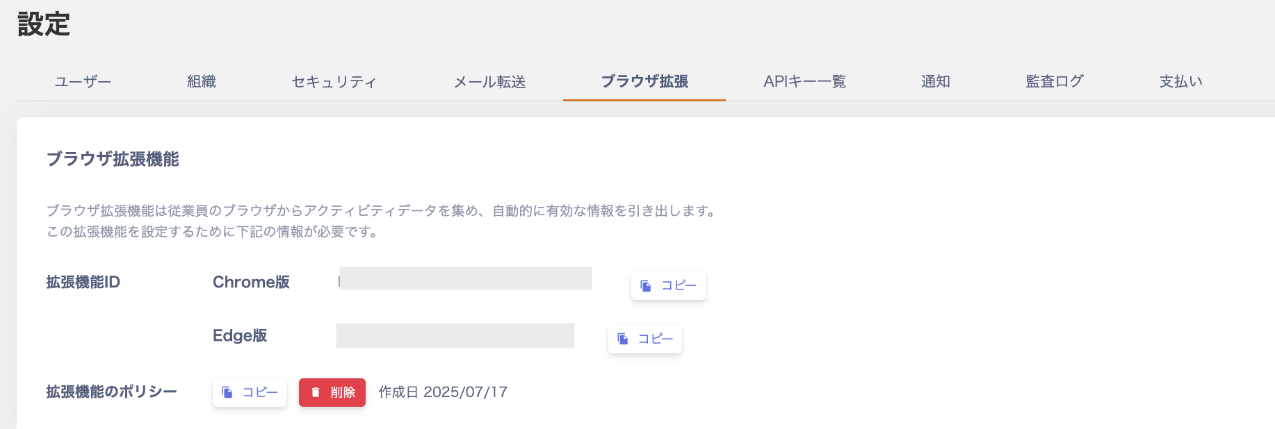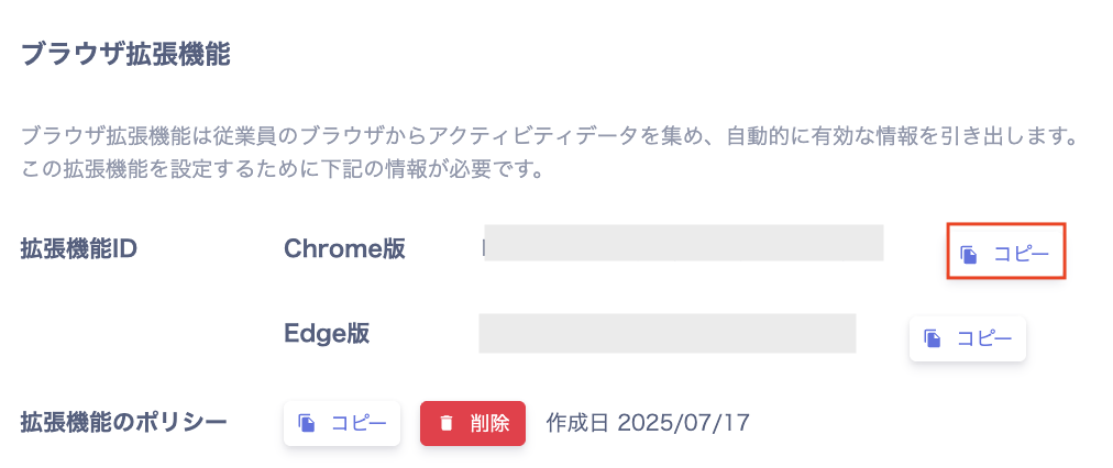 - Adminaにログインし、設定 > ブラウザ拡張 の拡張機能のポリシーで[コピー]をクリックします。