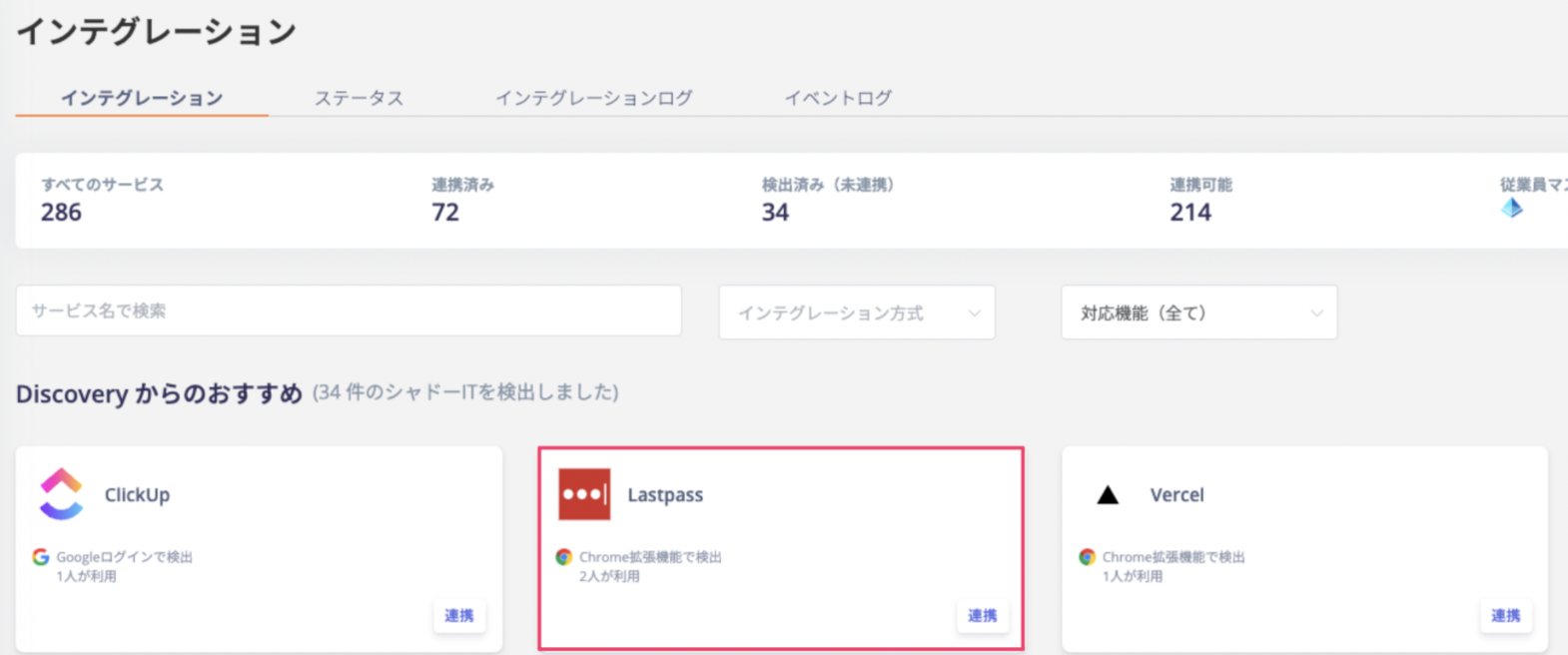 Adminaに連携可能なSaaSを拡張機能で検知した場合に、インテグレーション > インテグレーションタブのDisicoveryからのおすすめに表示されます。夜間にシステム同期を行い、検知から翌日以降に表示されます。