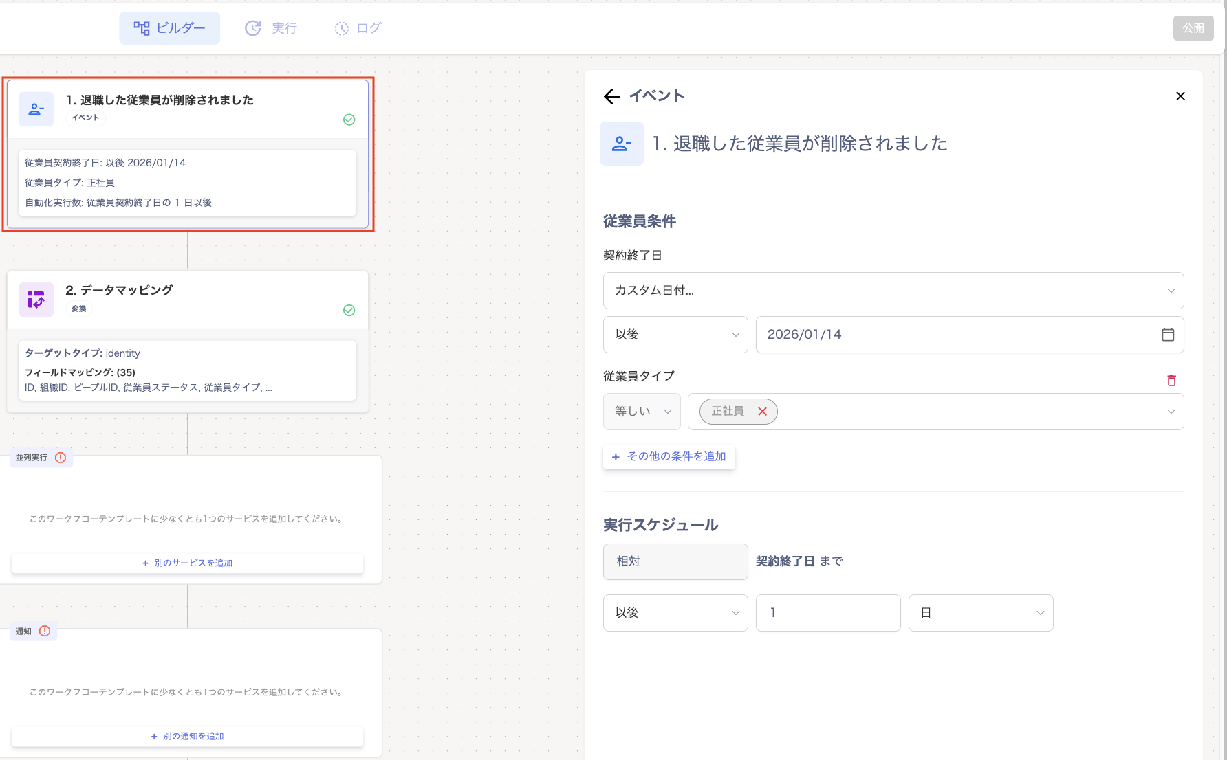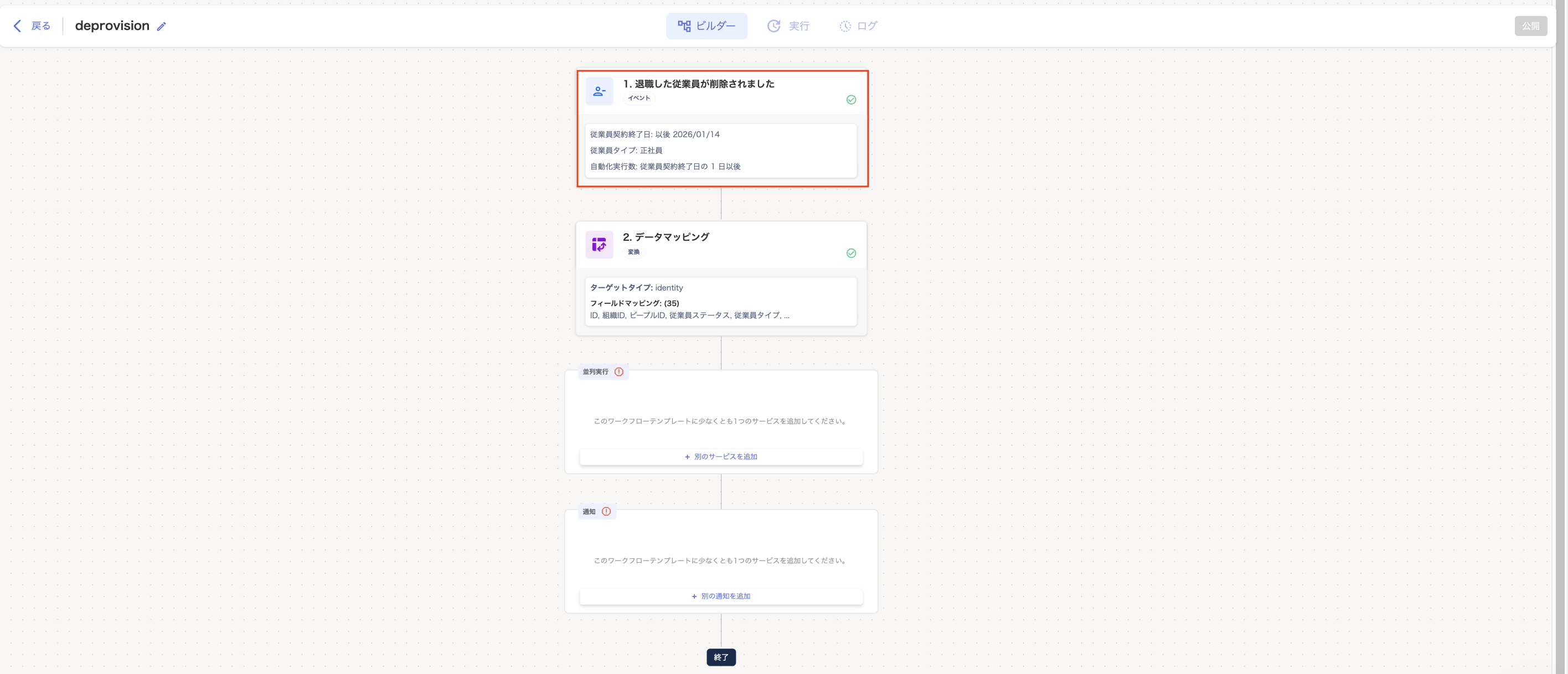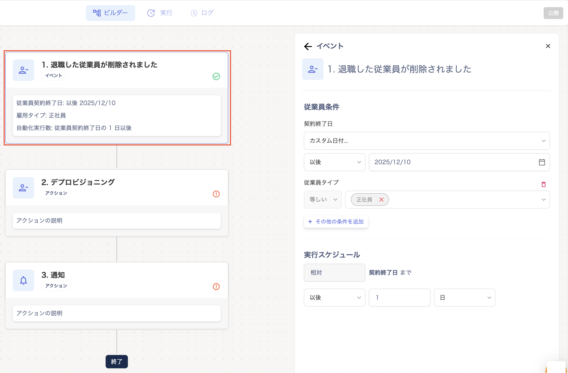 - 「deprovision」の「ビルダー」画面で「1. 退職した従業員が削除されました」をクリックします。