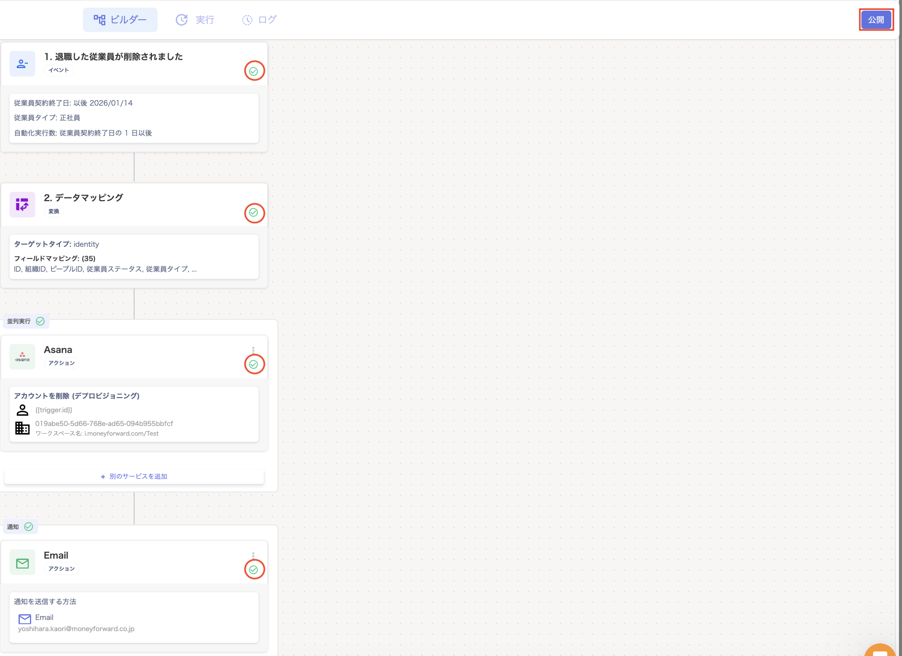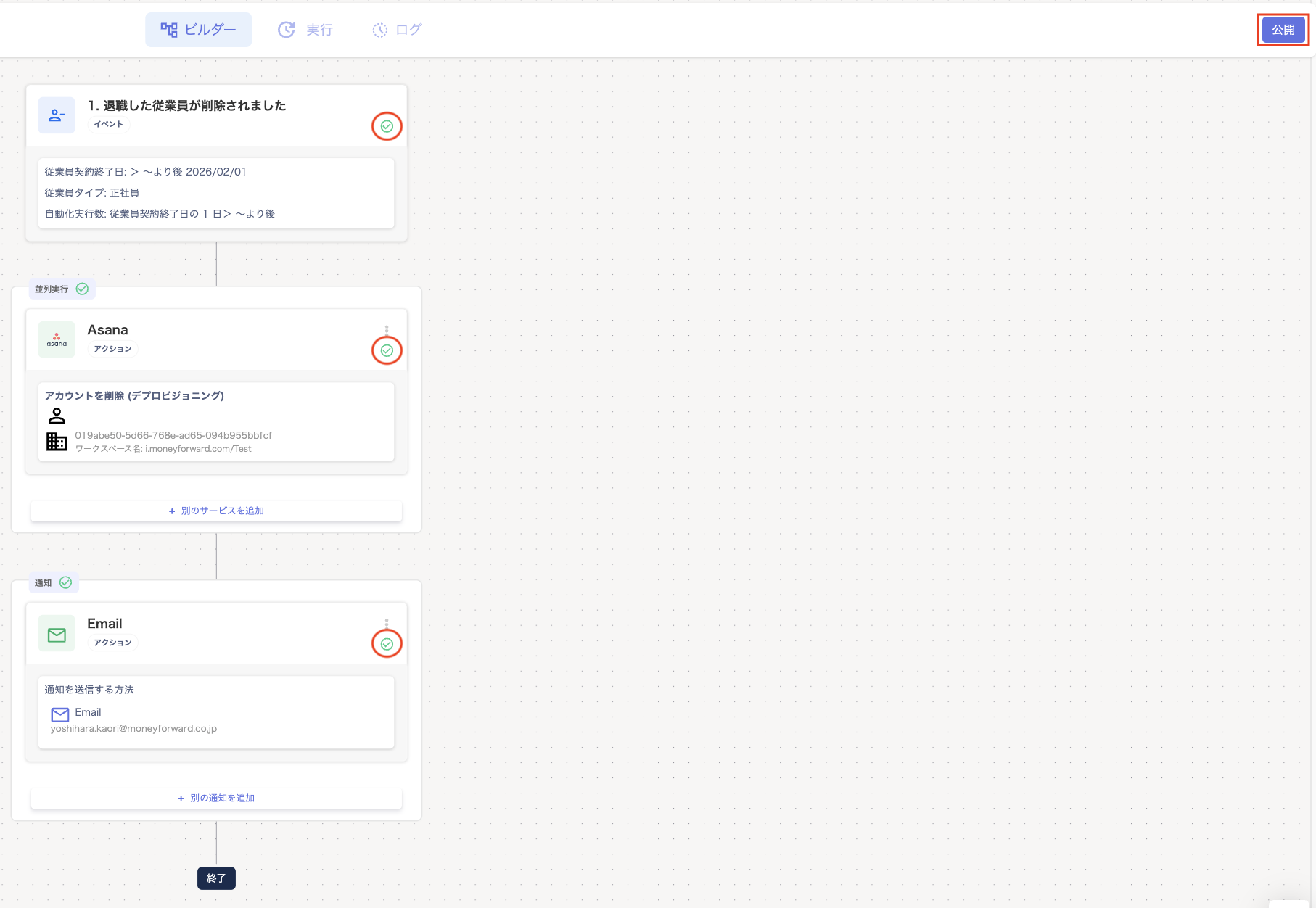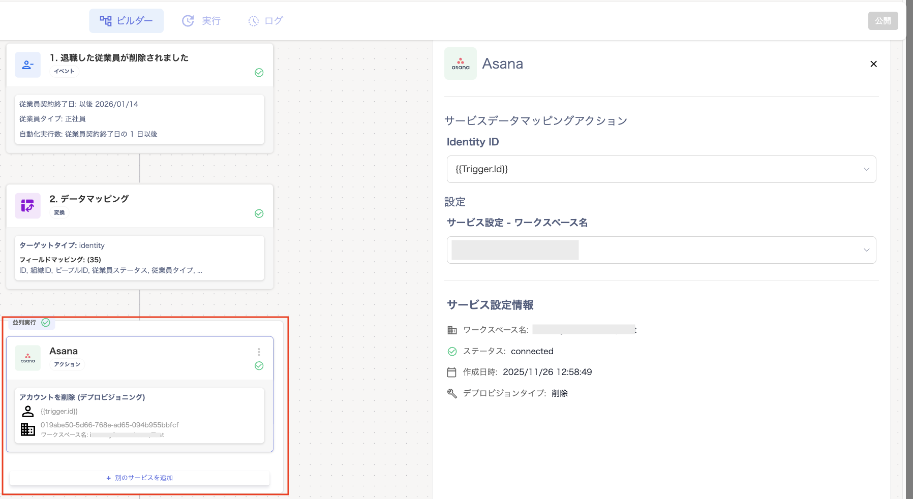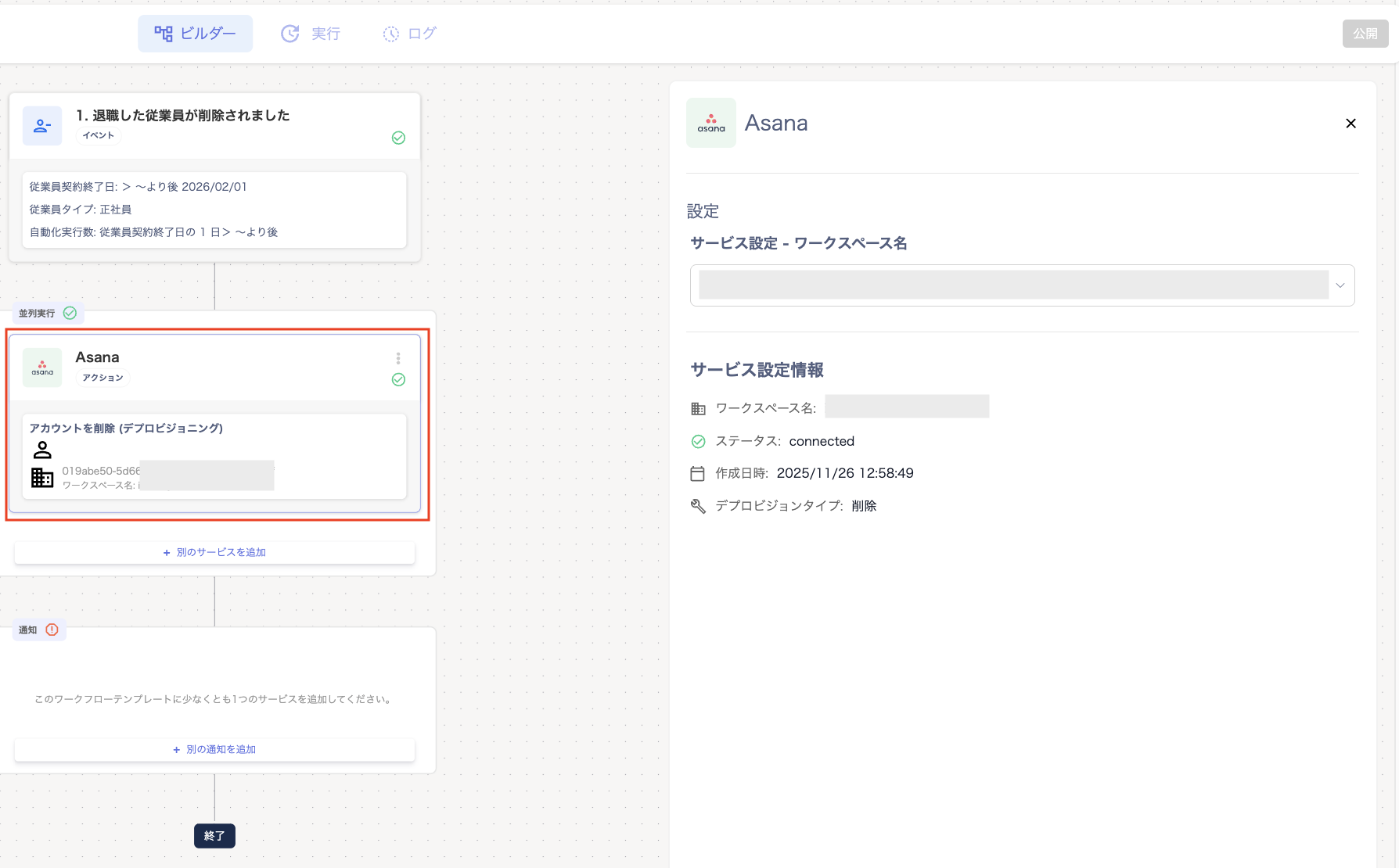 - 「deprovision」の「ビルダー」画面で「1. 退職した従業員が削除されました」をクリックします。