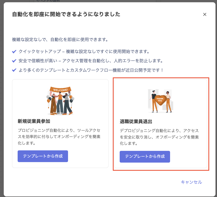 - 自動化 > [自動化を作成] > 「退職従業員退出」画面の[テンプレートを作成]をクリックします。