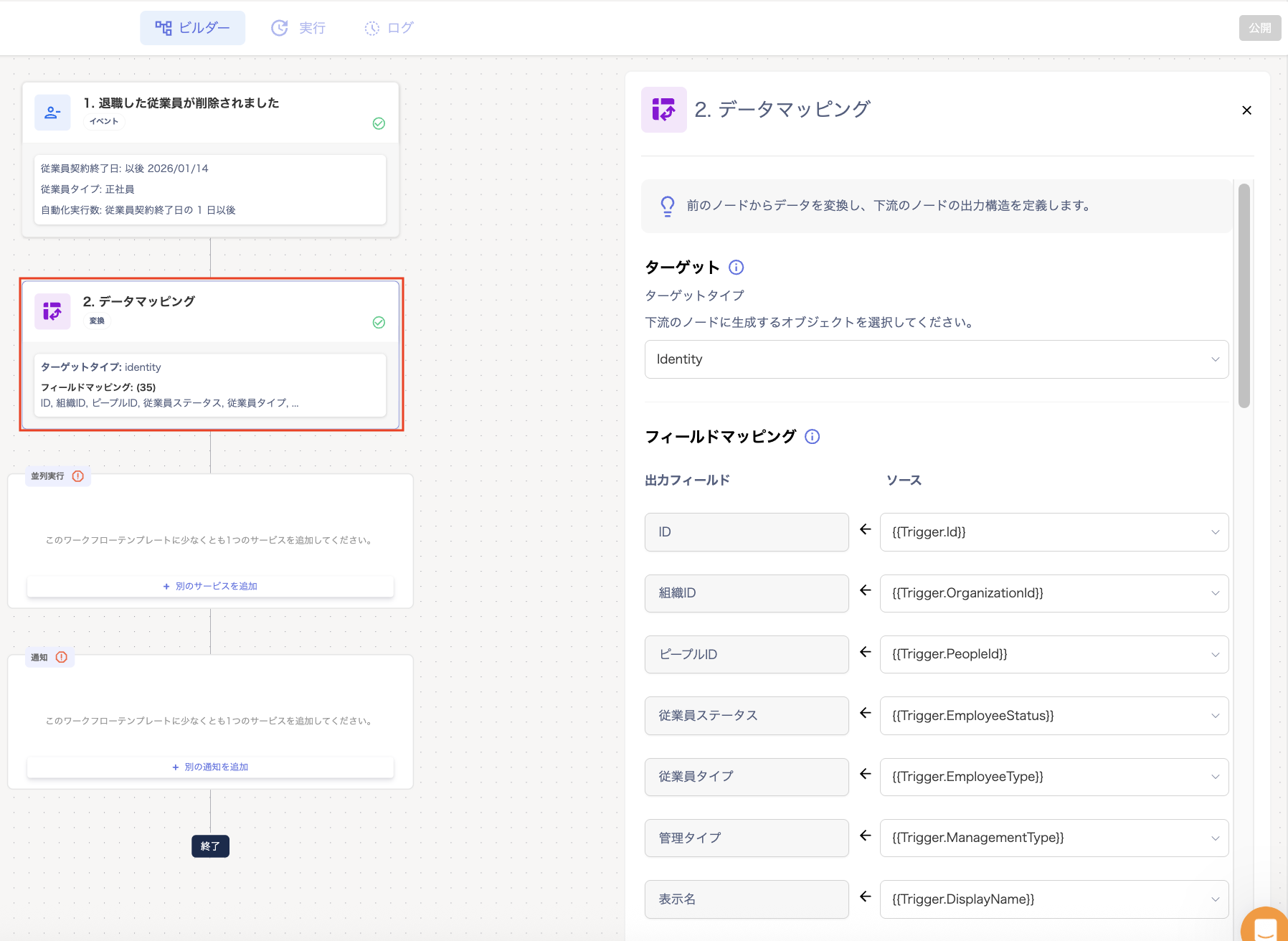 フィールドマッピング:データソースからターゲットフィールドへの変換ルールを定義します。 - 「並列実行」をクリックして、ワークフローに設定するサービスを追加します。