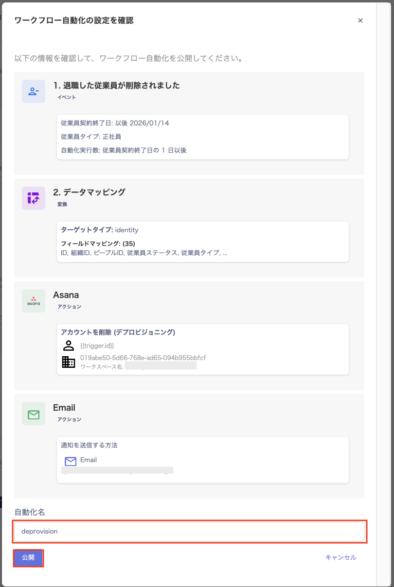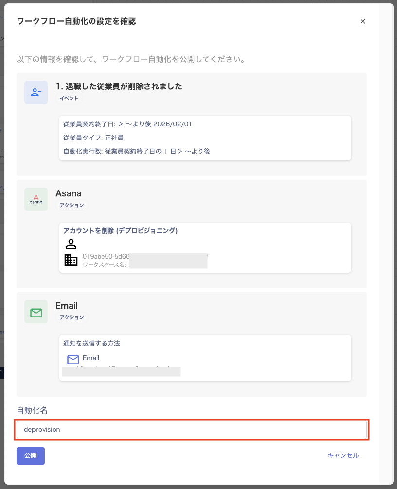 - 「ワークフロー自動化の設定を確認」画面が表示されますので、自動化名を入力して、[公開]をクリックします。
