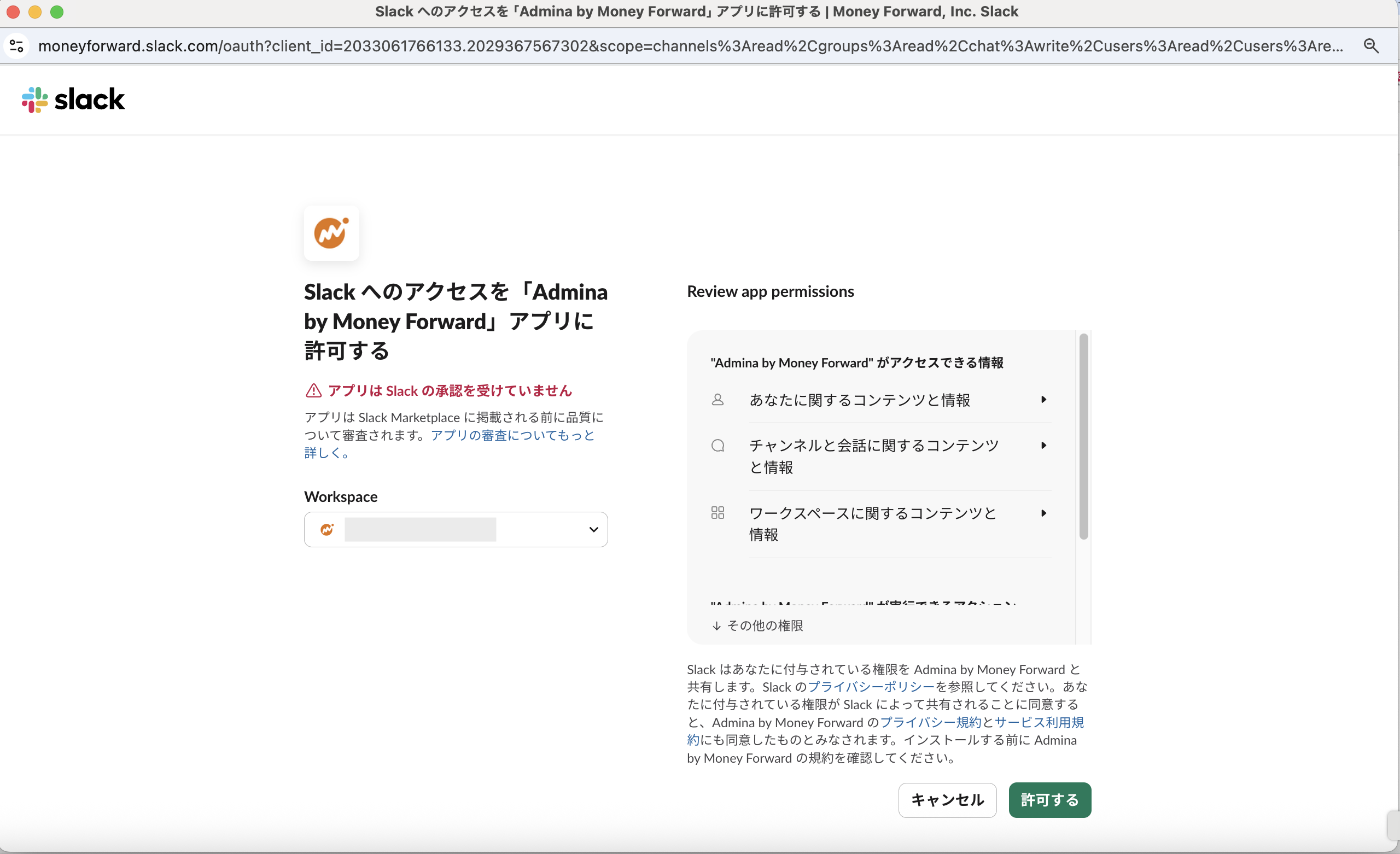 - 「Slack へのアクセスをAdmina by MoneyForwardアプリに許可する」画面が表示されますので、Workspaceを確認して、[許可する]をクリックします。