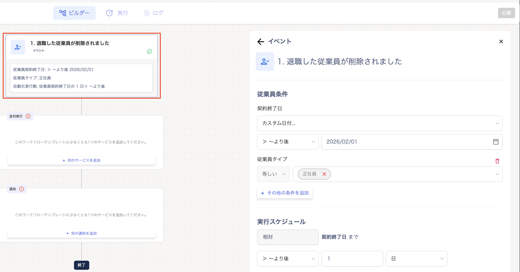 実行スケジュール:契約終了日まで[1(数値)][日/週][>〜より後(After)/日付(On)]をプルダウンから選択して設定します。 - 「並列実行」をクリックして、ワークフローに設定するサービスを追加します。