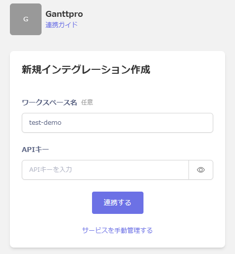 任意のワークスペース名、前の手順で取得したAPIキーを入力し、連携するをクリックします。