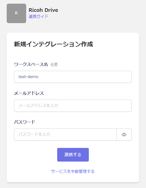 任意のワークスペース名、Ricoh Driveログイン用のメールアドレス・パスワードを入力し、連携するをクリックします。