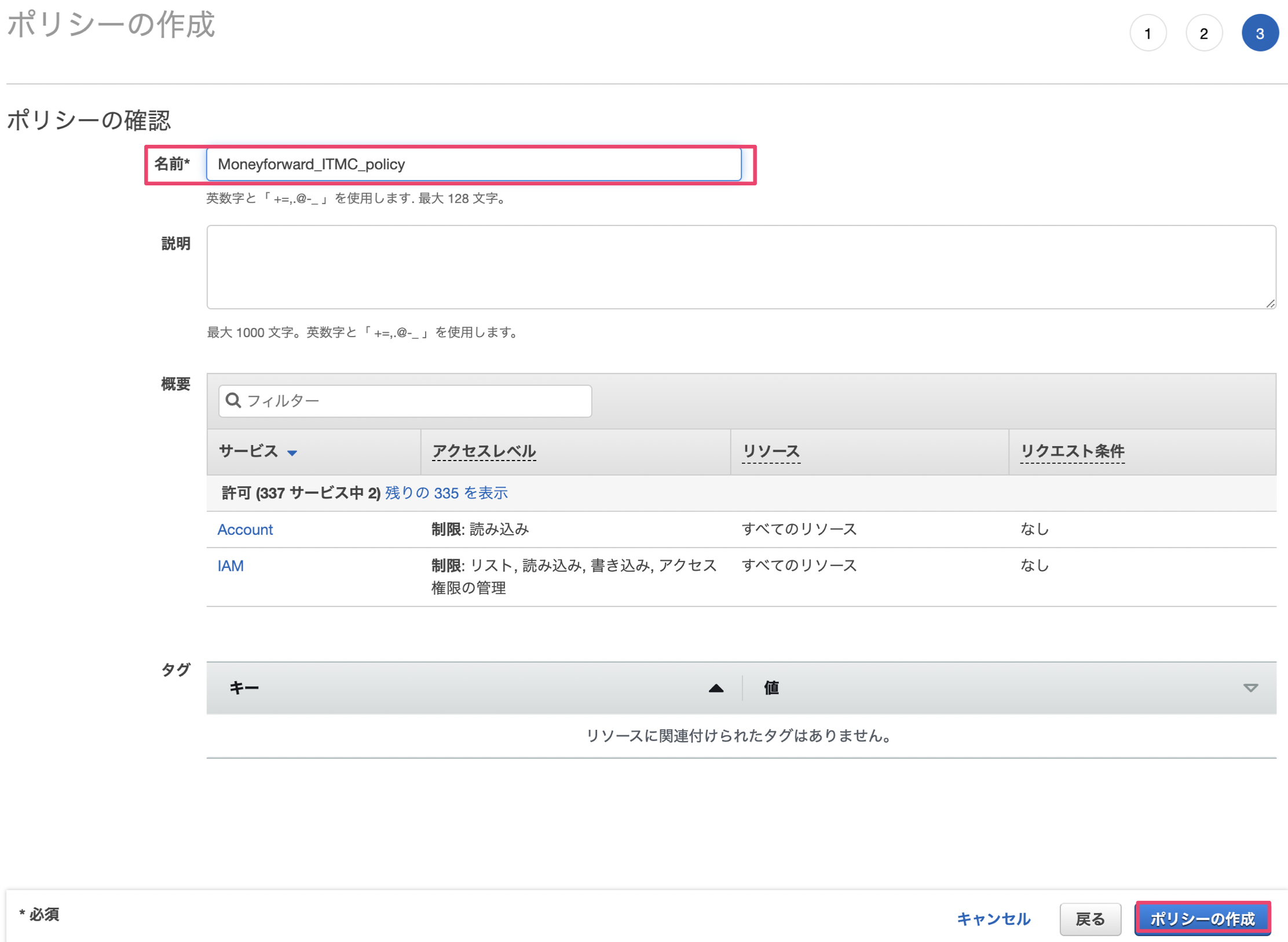 1. 次の画面でポリシー名に任意の名前を入力し、[ポリシーの作成]をクリックします。これでポリシーの作成が完了です。