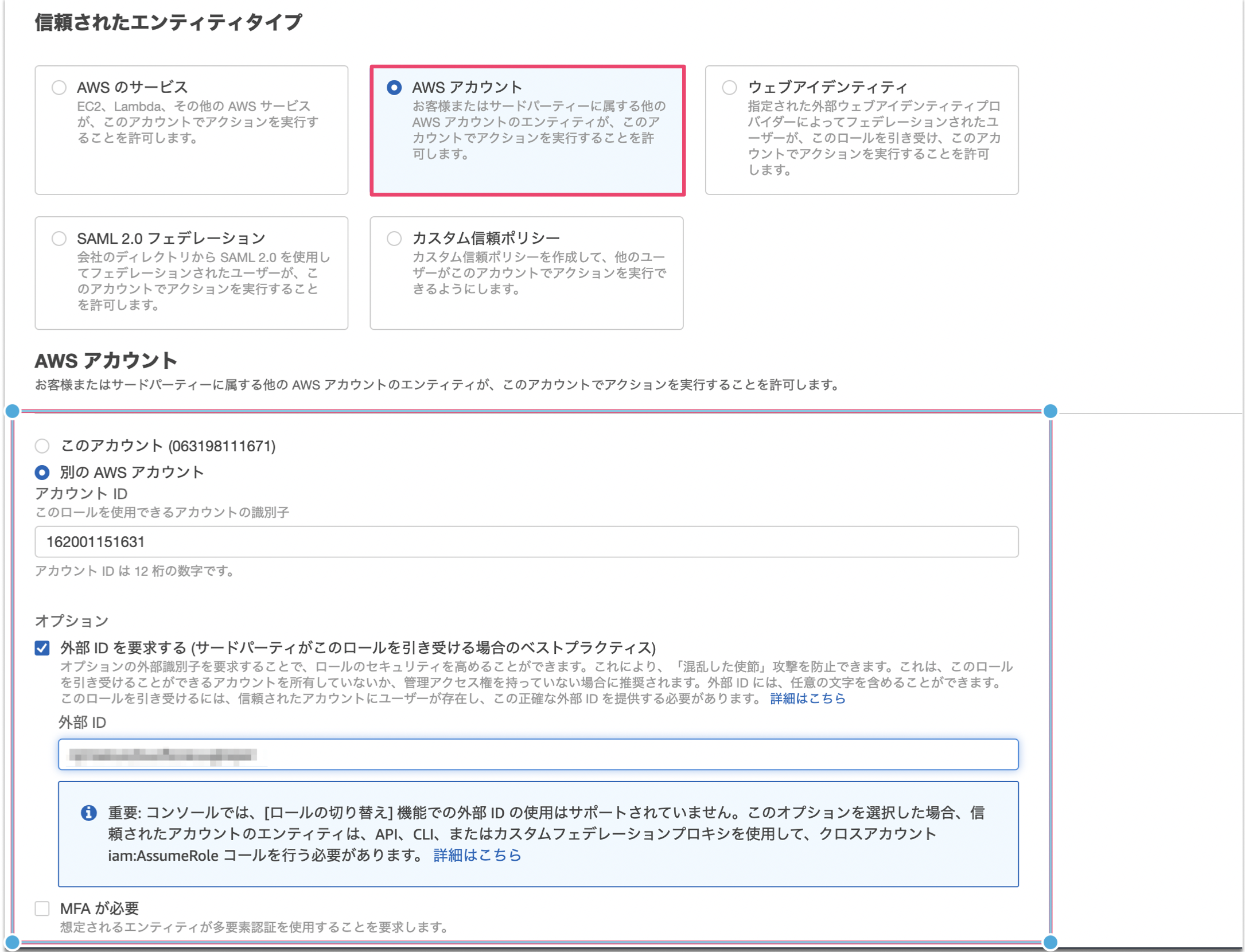 • AWSアカウント:「別のAWSアカウント」を選択し、アカウントIDに162001151631と入力します。