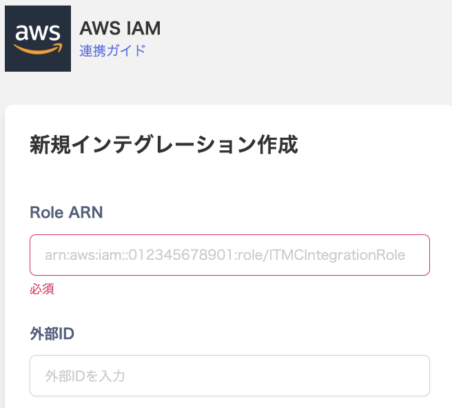 - 前の手順で取得したRole ARNおよび、ロール作成時に設定した外部IDを入力します。