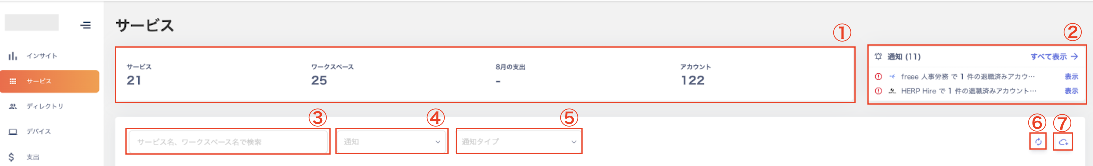 ③サービス名、ワークスペース名で検索:サービス一覧をサービス名とワークスペース名で検索できます。