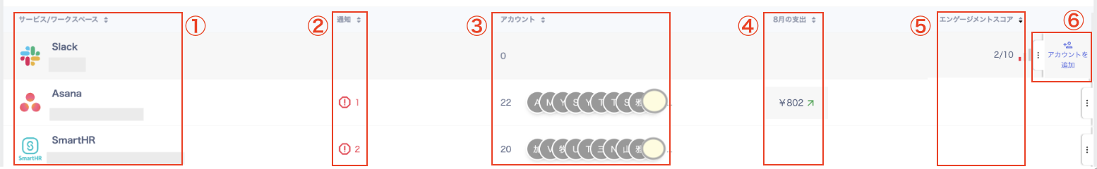 ①連携サービス一覧:サービス、ワークスペース、月の支出、アカウントを確認できます。