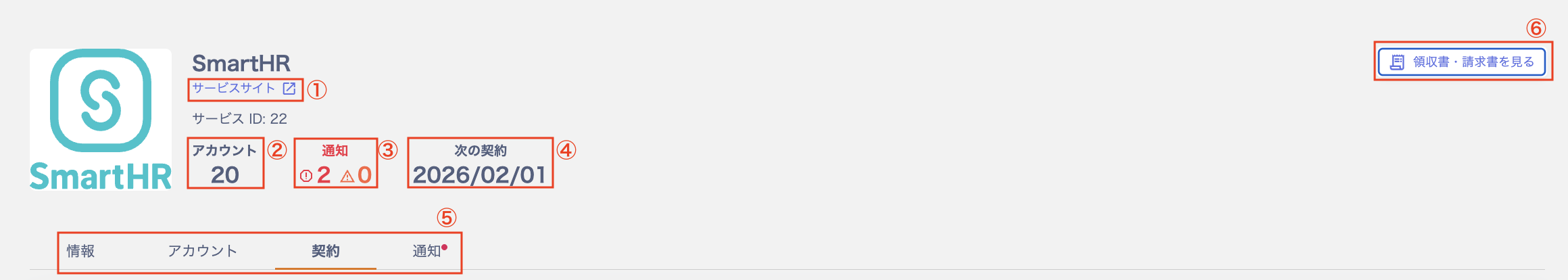 ⑤タブ:「情報/アカウント/契約/通知」タブを切り替えて確認します。