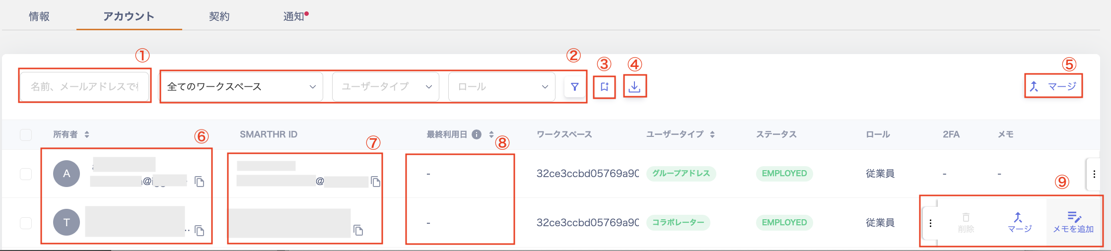 ①名前、メールアドレスで検索:アカウント一覧を名前、メールアドレスで検索できます。