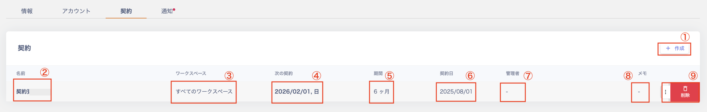 ⑨削除:登録した契約を削除できます。詳細は契約の削除・変更をご参照ください。