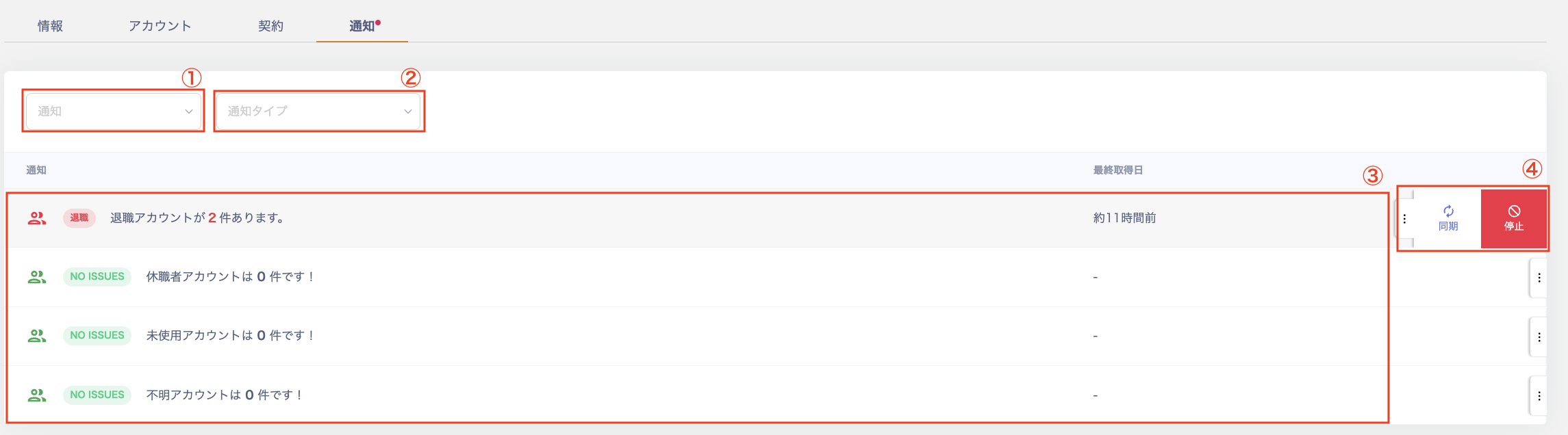 ②通知タイプ:通知タイプ「退職/休職/未使用/不明アカウント、公開ファイル」から絞り込めます。