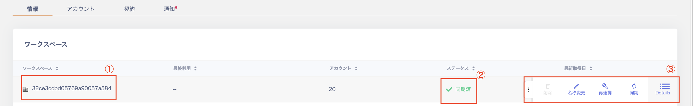 ①ワークスペース:連携済ワークスペース名を表示します。ワークスペースは複数登録できます。ワークスペース名をクリックすると、ワークスペースの情報を追加登録できます。詳細は複数のワークスペース(ドメイン、テナント)の管理についてをご参照ください。