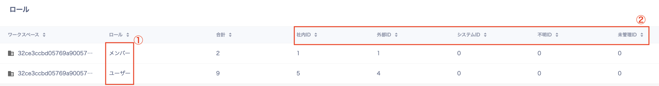 ①ロール、②ID種別での集計表です。集計表をクリックすると、「アカウント」画面が絞り込みした状態で表示されます。