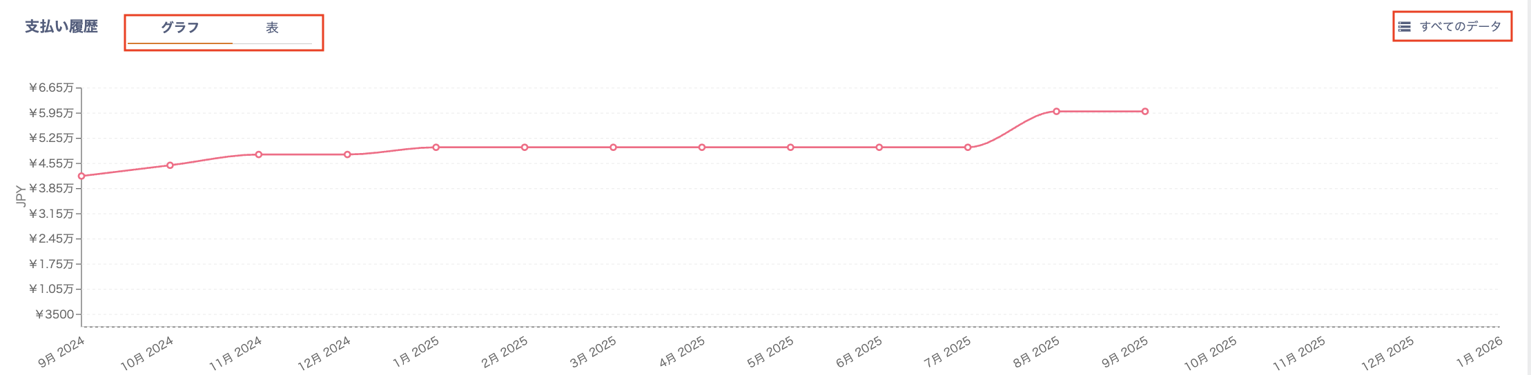 「グラフ/表」を切り替えて支払い履歴を確認できます。「すべてのデータ」をクリックすると、支出>支出に画面遷移します。