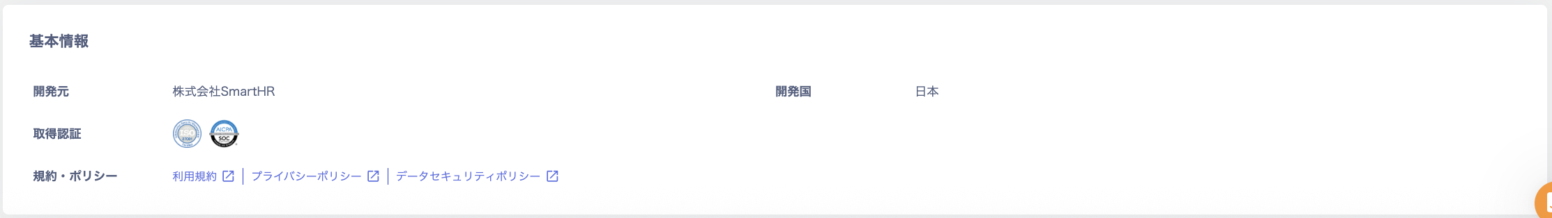 サービス側の「開発元/取得認証/利用規約/プライバシーポリシー/データセキュリティポリシー/開発国」を確認できます。