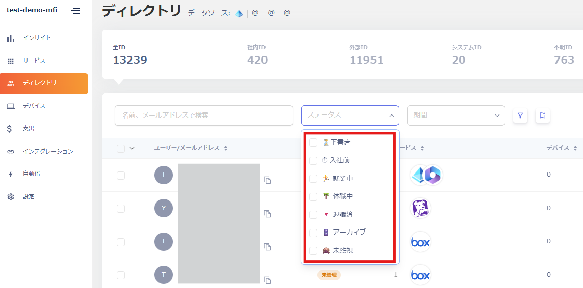 - 「社外」ラベル:メールアドレスがある、Oneloginに存在しないアカウントに対して付与されます。